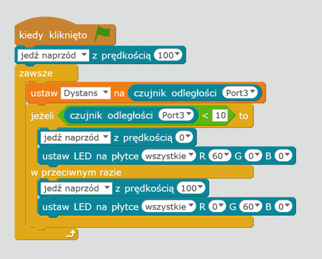 Podobne zadanie (z pętlą, zmienną i warunkiem) wykonamy, korzystając tym razem z wbudowanego czujnika odległości. Np. chcemy, by robot jechał do przodu świecąc diodami na zielono, a następnie 10 cm przed napotkaną przeszkodą zatrzymał się i zmienił kolor świateł na czerwony. Tworzymy zmienną i nazywamy ją np. „Dystans”, budujemy skrypt, na który składać się będą bloczki: pętla „zawsze”, instrukcja warunkowa „jeżeli… to, w przeciwnym razie…” i warunek określony przez nas jako odległość od przeszkody mniejsza niż 10 cm. W przykładowym skrypcie robot będzie jechał do przodu mając zapalone zielone światełka, a kiedy znajdzie się przed przeszkodą, zatrzyma się („pojedzie” z prędkością 0) i zmieni kolor diod na czerwony.
