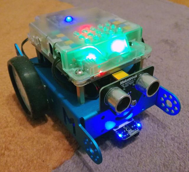 mBot to niewielki robot edukacyjny, stworzony w 2013 r. przez chiński start-up Makeblock. Wykorzystuje sprzęt i rozwiązania zgodne z otwartą platformą programistyczną Arduino. Można go programować zarówno w środowisku tekstowym (Arduino IDE), jak i graficznym (Scratch), co daje całkiem spore możliwości prowadzenia zajęć z dziećmi i młodzieżą. Posiada czujniki światła, odległości i linii, ale można go też rozbudowywać o dodatkowe elementy, np. czujniki temperatury czy dźwięku.