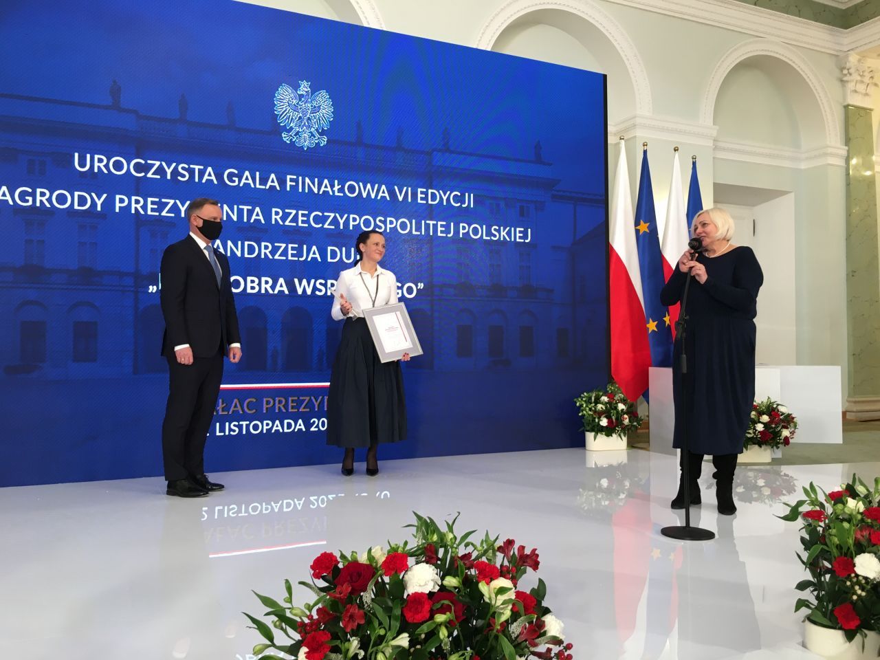 Zuzanna Janaszek-Maciaszek, prezes Fundacji Podaj Dalej z Konina, prezydent Andrzej Duda i Ewa Pawłowska, prezes Integracji podczas uroczystości przyznania Nagrody Prezydenta „Dla dobra wspólnego”, w kategorii: Nagroda Specjalna im. Piotra Pawłowskiego.