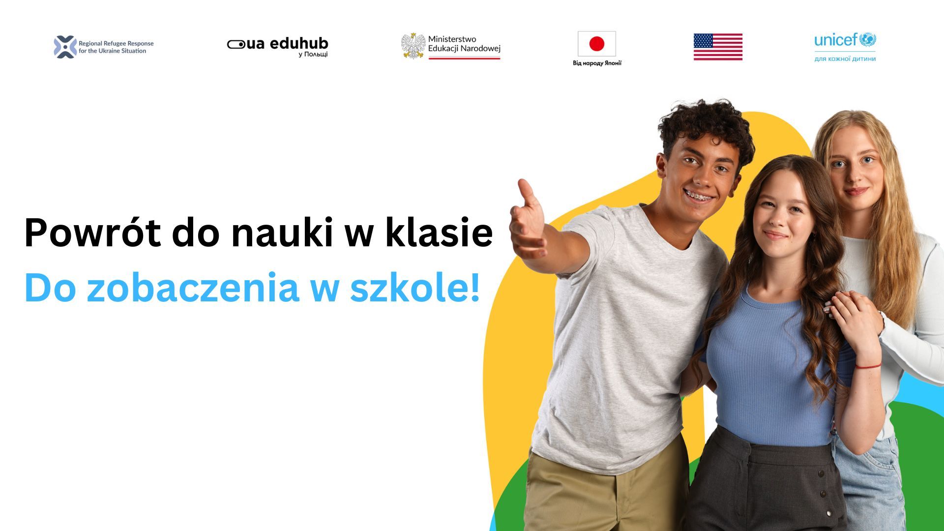 Kampania „Powrót do nauki w klasie” jest częścią partnerstwa pomiędzy Funduszem Narodów Zjednoczonych na Rzecz Dzieci (UNICEF) a Ministerstwem Edukacji Narodowej Polski. Jest realizowana przy hojnej pomocy Rządu Japonii oraz Biura ds. Ludności, Uchodźców i Migracji Departamentu Stanu USA (PRM) oraz we współpracy z partnerami humanitarnymi i organizacjami społeczeństwa obywatelskiego działającymi w obszarze edukacji.