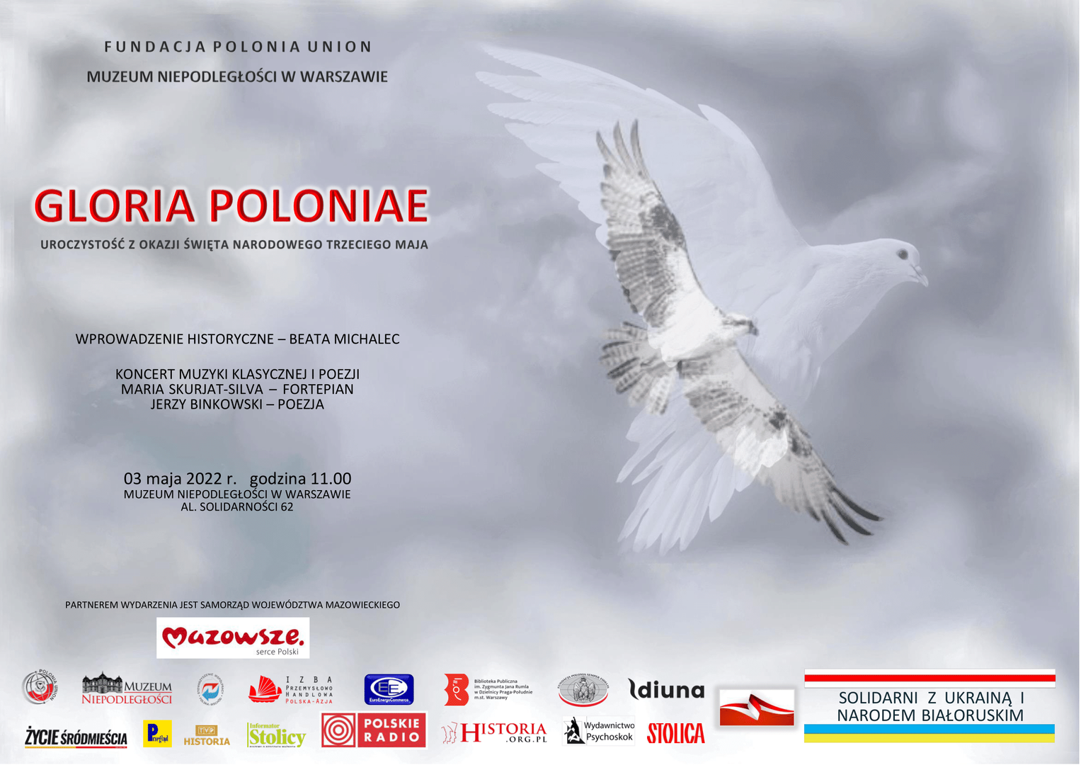 3 maja 2022 r. w Sali Multimedialnej Muzeum Niepodległości w Warszawie Fundacja Polonia Union we współpracy z Samorządem Województwa Mazowieckiego, Muzeum Niepodległości w Warszawie oraz partnerami i patronami medialnymi zorganizowała uroczystość historyczno-artystyczną GLORIA POLONIAE z okazji 231. rocznicy uchwalenia Konstytucji 3 maja 1791 oraz 25-lecia uchwalenia obowiązującej Konstytucji Rzeczypospolitej Polskiej z dnia 2 kwietnia 1997 r.
