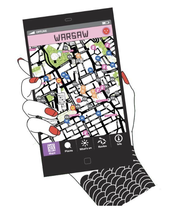 Podobnie jak w wersji papierowej, bogato ilustrowana aplikacja prezentuje ponad 100 subiektywnie wybranych miejsc dających pojęcie o charakterze miasta, przedstawiających ulubione miejsca spotkań młodego pokolenia warszawiaków. Dodatkowo aplikacja zwiera podstawowe informacje o Warszawie, komunikacji, hostelach, galeriach, zwyczajach mieszkańców naszego miasta. Została przygotowana specjalnie z myślą o turystach w wieku 18-35, tzw. "travellersach". ZOBACZ PODGLĄD MAPY: +TU