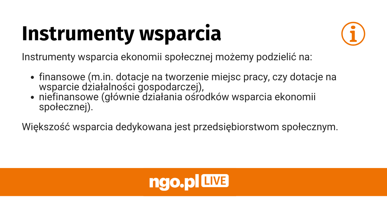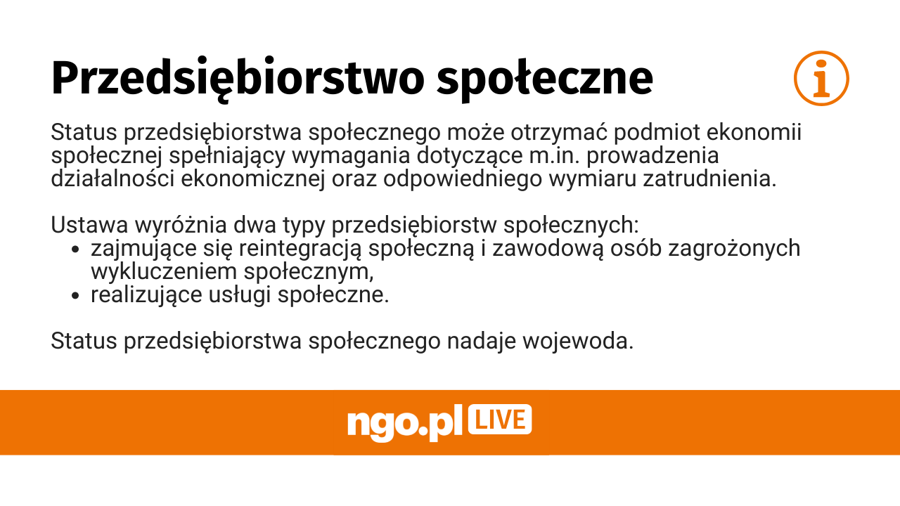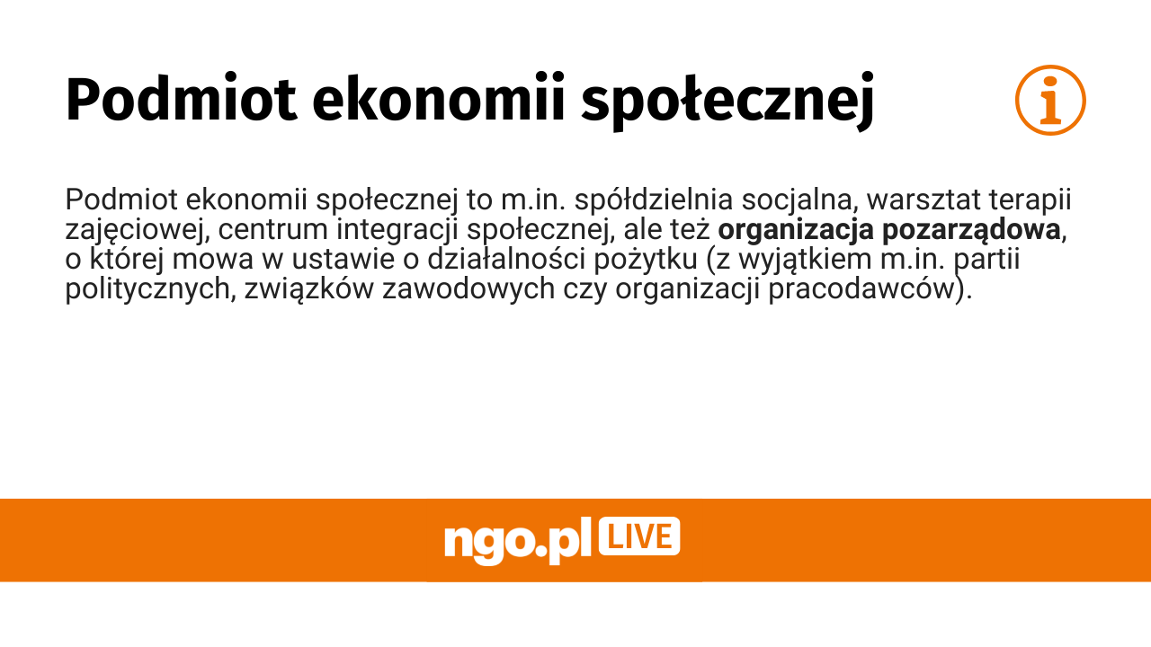 Warto mieć powyższe na uwadze, bowiem w przypadku różnych form wsparcia finansowego (np. dotacji) lub niefinansowego (np. wsparcie doradcze udzielane przez ośrodki wsparcia ekonomii społecznej) może pojawiać się właśnie sformułowanie „podmiot ekonomii społecznej”, a niekoniecznie pojęcie organizacji pozarządowej. Dobrze jest więc wiedzieć, że wsparcie - przynajmniej potencjalnie - adresowane jest też do nas. Zapewne też pojęcie „podmiot ekonomii społecznej” pojawiać się będzie dużo częściej w samym portalu ngo.pl.