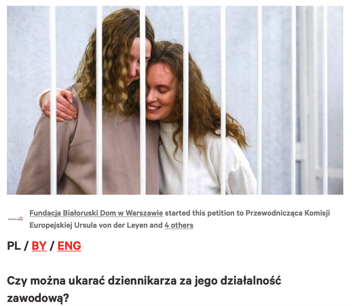 Fundacja Białoruski Dom w Warszawie uprzejmie informuje o rozpoczęciu zbiórki podpisów pod petycją na rzecz uwolnienia dwóch dziennikarek telewizji Biełsat – Kaciaryny Andrejewej (Bachwaławej) i Darii Czulcowej. Petycja ma na celu zachęcenie do wykorzystania wszystkich dostępnych środków w celu uwolnienia obu dziennikarek Biełsatu, jak również przestrzegania zasad prawa i przyspieszenia rozwiązania kryzysu politycznego na Białorusi.