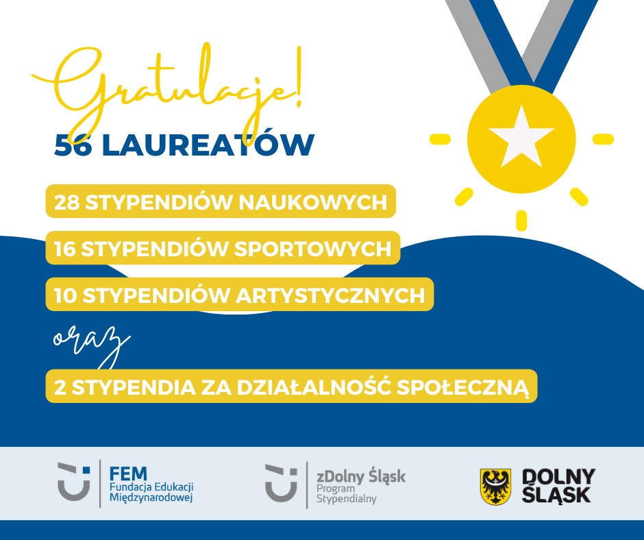 Stypendia dofinansowane są z dotacji Samorządu Województwa Dolnośląskiego oraz ze środków pochodzących z 1% odpisów podatkowych na rzecz FEM. Listę laureatów XXIII edycji Programu Stypendialnego „zDolny Śląsk” można znaleźć na stronie organizatora - Fundacji Edukacji Międzynarodowej: https://www.fem.org.pl/wyniki-xxiii-konkursu-stypendialnego-zdolny-slask/