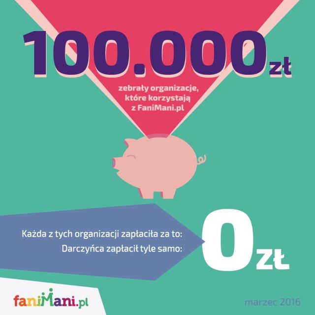 Łączna kwota zebranych darowizn przez serwis FaniMani.pl dla podmiotów trzeciego sektora przekroczyła właśnie 100 000 zł. Organizacje społeczne oraz darczyńcy nie ponieśli z tego tytułu żadnych kosztów.