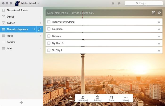 Próbowałem kilku narzędzi – Todoist, To.Do, nawet funkcji przypomnień w Evernote i Google Keep, ale dopiero przy Wunderlist trafiłem dokładnie na to, czego poszukiwałem. Jest przejrzyste, proste w obsłudze, a co najważniejsze, działa szybko i ma swoją aplikację desktopową. To ważne, bo podczas pracy na komputerze raczej nie chciałoby mi się sięgać po smartfona, żeby dodać przypomnienie o zrobieniu zakupów wieczorem. Po prostu bym ich nie zrobił.