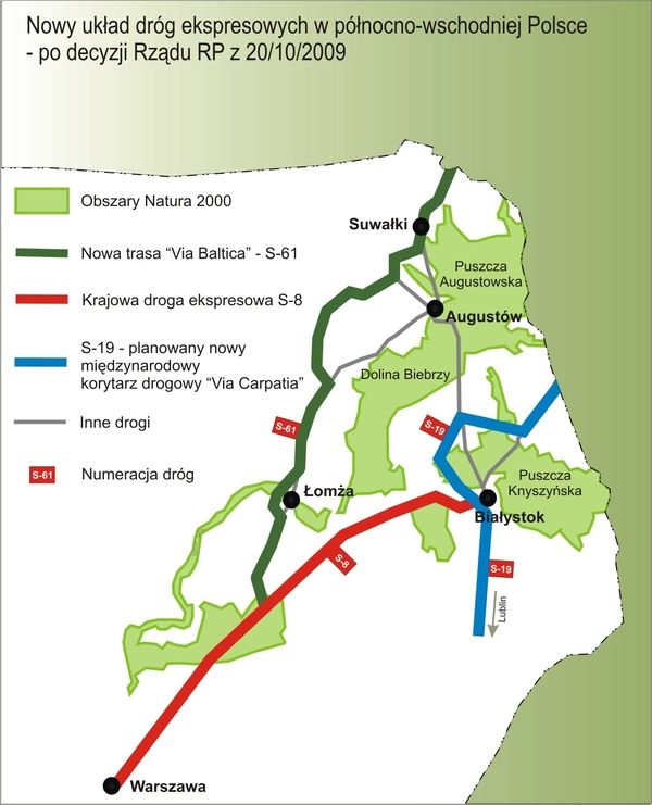 Według przyjętych zmian w Rozporządzeniu w sprawie przebiegu dróg ekspresowych i autostrad, trasa drogi ekspresowej „Via Baltica” (pan-europejskiego korytarza transportowego mającego łączyć Warszawę z Helsinkami) zamiast przez Puszczę Knyszyńską, Dolinę Biebrzy i Puszczę Augustowską (tzw. wariant białostocki) będzie wiodła przez Łomżę i omijała większość obszarów Natura 2000 w regionie. Zatwierdzony wariant jest zgodny z wynikami strategicznej oceny oddziaływania na środowisko - najmniej szkodliwym rozwiązaniem dla przyrody. Dodatkowo został on wysoko oceniony wg. kryteriów transportowych, społecznych i ekonomicznych.