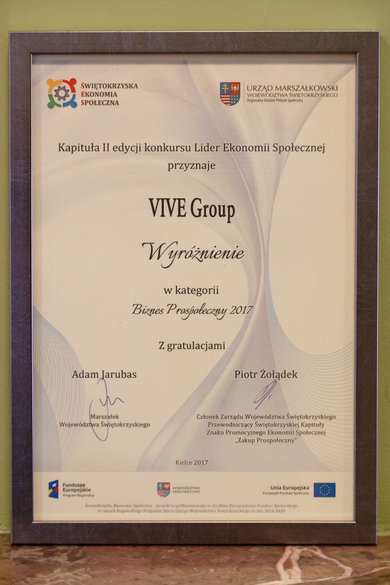 1 grudnia w Wojewódzkim Domu Kultury Kielcach odbyła się Gala Ekonomii Społecznej, podczas której rozstrzygnięto konkurs Lider Ekonomii Społecznej. W kategorii biznes prospołeczny wyróżniono Grupę VIVE, czyli dziewięć powiązanych ze sobą spółek, z których główna – VIVE Textile Recycling, działając od 25 lat, jest liderem branży recyklingu tekstyliów w Polsce i Europie.