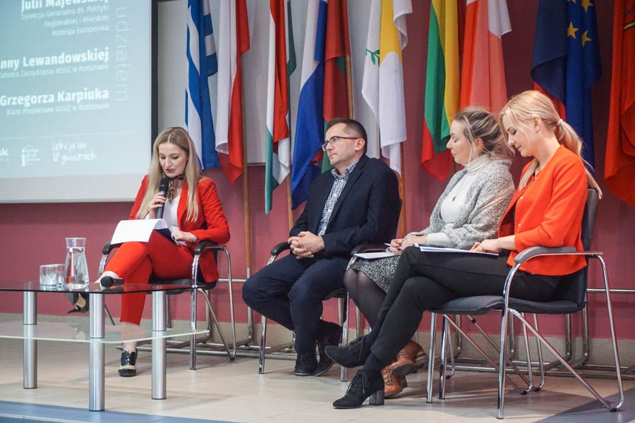 Wśród panelistów znaleźli się Julia Majewska z Dyrekcji Generalnej ds. Polityki Regionalnej i Miejskiej Komisji Europejskiej, która na co dzień zajmuję się wdrażaniem funduszy unijnych w Polsce. Oprócz nadzoru nad realizacją Regionalnego Programu Operacyjnego dla Województwa Podkarpackiego, odpowiada także za kwestie związane ze środowiskiem oraz komunikacją dotyczącą funduszy; dr Anna Lewandowska – Adiunkt w Katedrze Zarządzania Wyższej Szkoły Informatyki i Zarządzania w Rzeszowie – ekspert ds. przedsiębiorczości, innowacji i rozwoju regionalnego, a także członkini Podkarpackiej Rady Innowacyjności oraz Grzegorz Karpiuk, kierownik Zespołu Projektowego WSIiZ, wspomagającego pracowników Uczelni w przygotowywaniu projektów finansowanych głównie z Europejskiego Funduszu Społecznego.