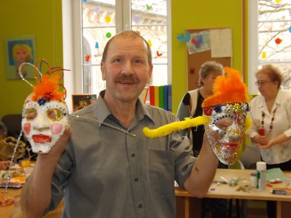 Podczas dzisiejszego spotkania Seniorki otrzymały pakiet niezbędnych materiałów i przygotowywały dla siebie kolorowe maski karnawałowe. Pomagał im w tym wolontariusz - artysta plastyk Janek, który poprowadził zajęcia artystyczne. Zajęcia zakończyły się wspólnym zdjęciem wszystkich masek i ich autorek.