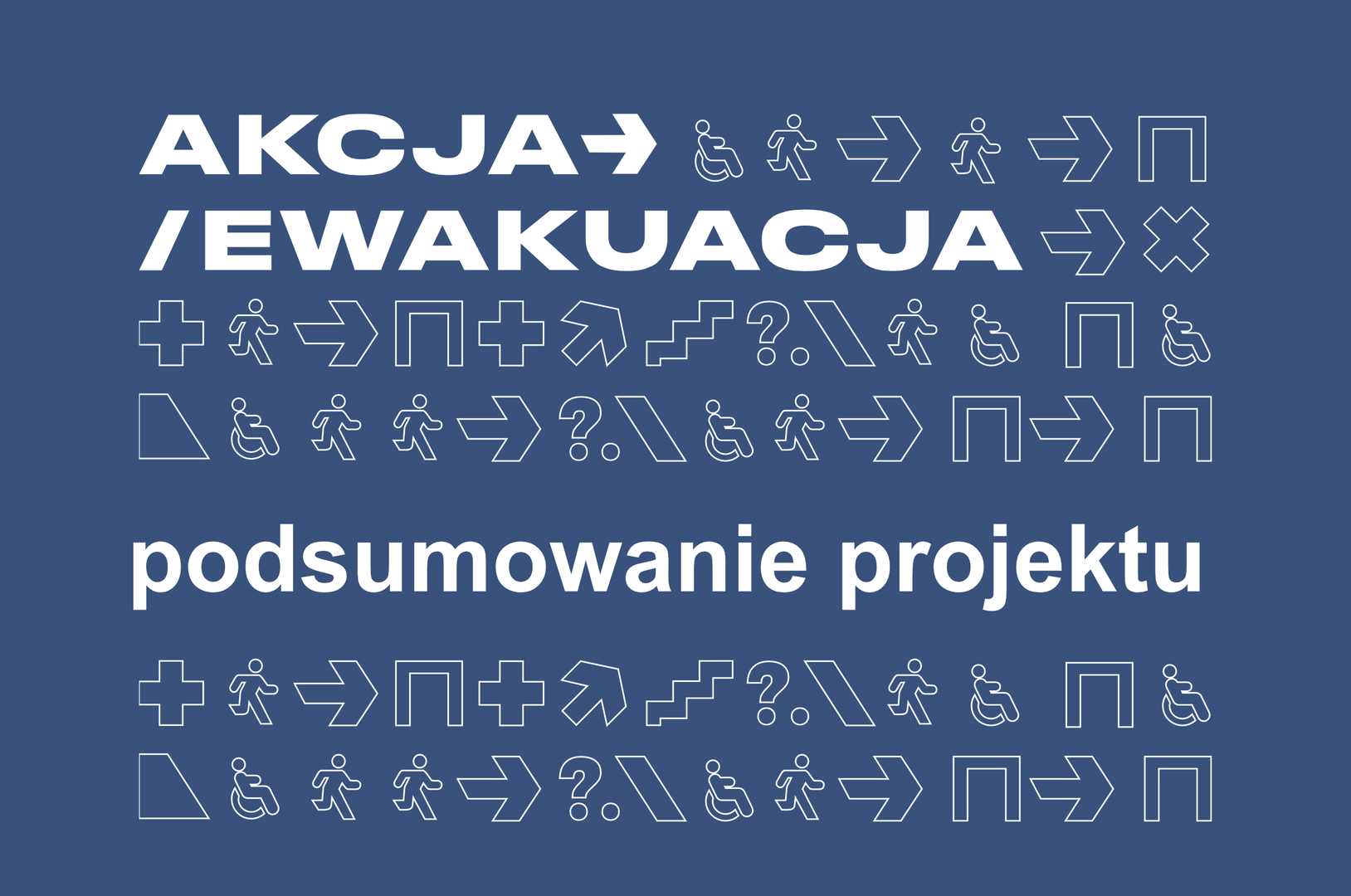 Grafika projektu: na granatowym tle białe napisy: na górze Akcja Ewakuacja, poniżej – podsumowanie projektu; obok i poniżej duża ilość linearnych piktogramów, nawiązujących do oznaczeń ewakuacyjnych w budynku - osoby biegnące, osoby na wózkach, strzałki kierunkowe i uproszczone rysunki schodów i wyjść ewakuacyjnych.