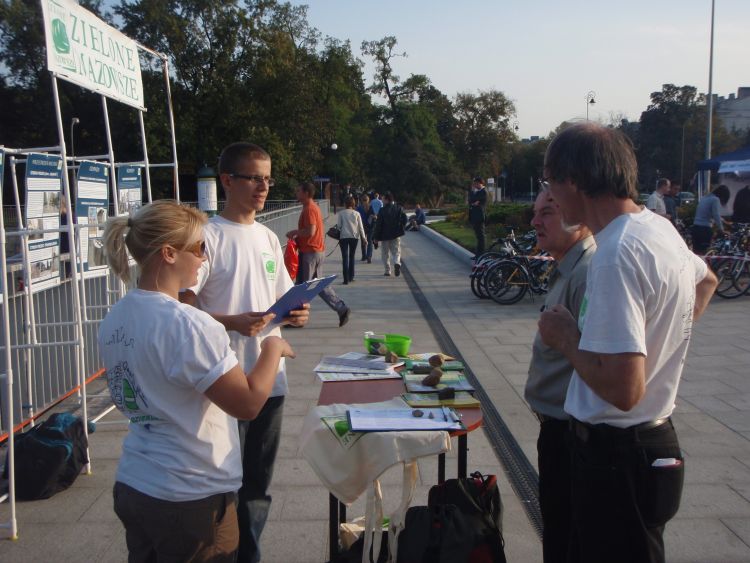 Zielone Mazowsze chce dotrzeć do mieszkańców stolicy ze swoim ekologicznym przekazem, by w ten sposób zachęcić warszawiaków do odpowiedzialnego i świadomego traktowania np. problemu komunikacji. Bo przecież to my sami, jeżdżąc samochodami po centrum miasta, tworzymy korki i zanieczyszczamy powietrze spalinami. Dlatego właśnie zorganizowano uliczną kampanię „Zielona Warszawa”, która składała się z kilku akcji – każda o innym przebiegu. Pod Ogrodem Zoologicznym zbierano podpisy pod petycją do dyrekcji ZOO w sprawie otwarcia ogrodu od strony przystanków tramwajowych, by ułatwić zwiedzania zoo niezmotoryzowanym. Wręczano także „eko-mandaty” kierowcom źle zaparkowanych samochodów. Przed Dniem bez Samochodu wolontariusze informowali przechodniów, na czym polegają społeczne korzyści korzystania z komunikacji miejskiej. Interweniowano także w sprawie niefortunnie zainstalowanych przycisków przy przejściach dla pieszych. Informował o tym transparent rozwieszony na Placu Konstytucji. W tych okolicach przyciski rzeczywiście utrudniają pokonanie ulicy pieszym. Podczas Masy Krytycznej zbierano natomiast podpisy pod apelem w sprawie zmian w ruchu drogowym.
