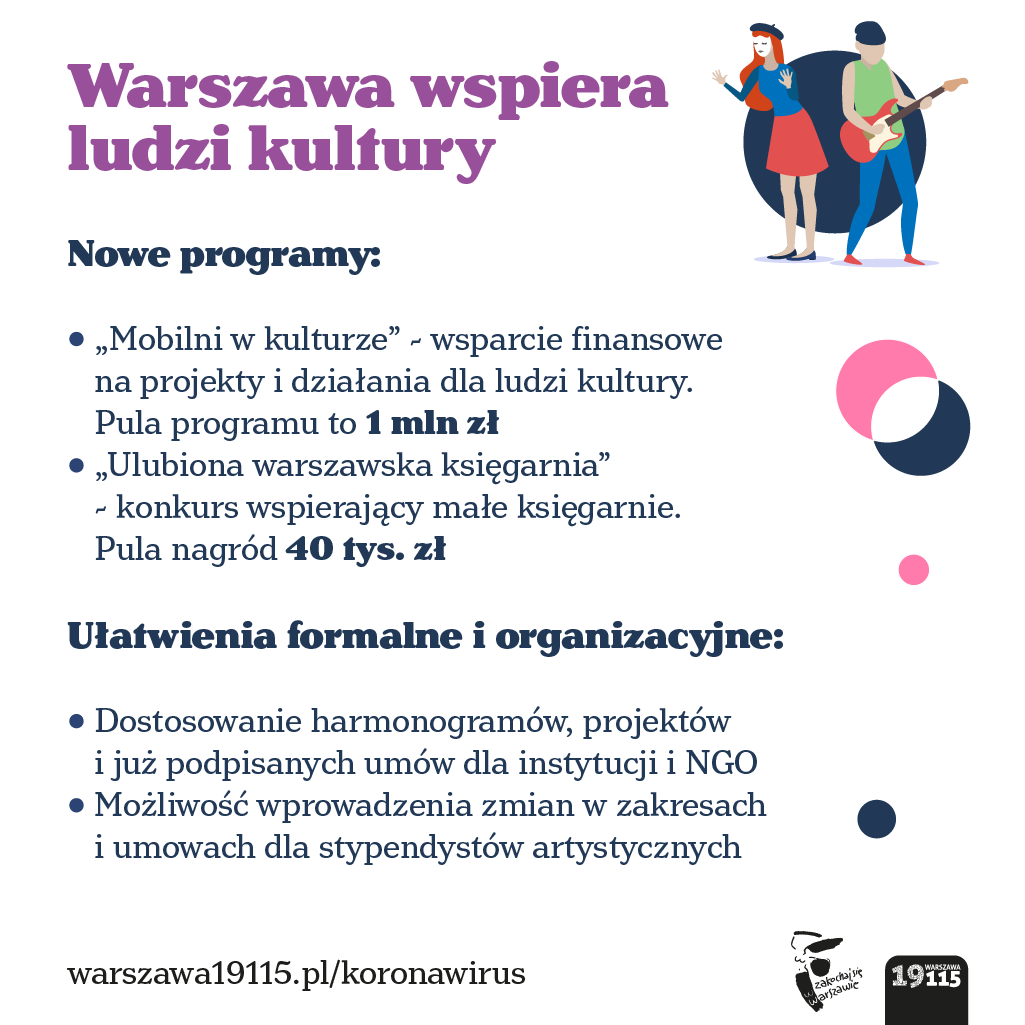 Warszawa uruchamia specjalny, dedykowanykonkurs w ramach wsparcia dla ludzi kultury – „Mobilni w kulturze”. Jest to otwarty konkurs ofert dla organizacji pozarządowych na wsparcie ludzi kultury. Miasto przeznaczyło na ten cel 1 mln zł.