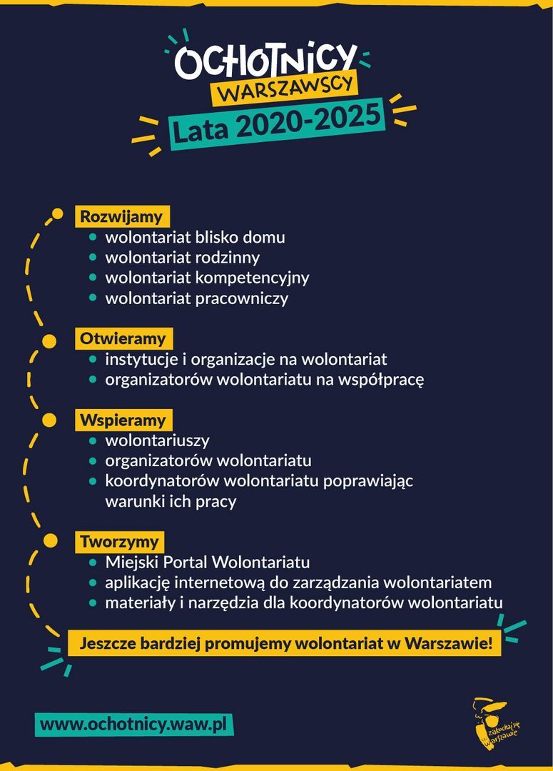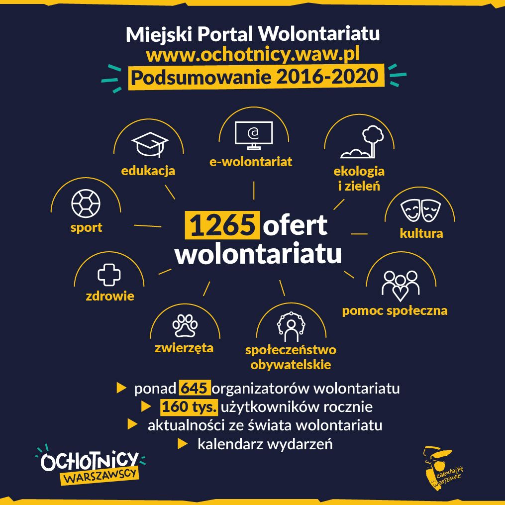 Najważniejszym elementem projektu „Ochotnicy warszawscy”, który realizujemy w Warszawie od 2016 r., było rozwijanie miejskiego portalu wolontariatu. Pod adresem www.ochotnicy.waw.pl zainteresowani mieszkańcy mogą znaleźć aktualne oferty wolontariatu, które mogą umieszczać organizacje lub instytucje. Od 2016 r. ponad 640 podmiotów zamieściło pod tym adresem łącznie blisko 1300 ofert wolontariatu. W ciągu ostatnich pięciu lat zrealizowaliśmy również cztery kampanie społeczne, aby promować wolontariat wśród mieszkańców Warszawy jako sposób na aktywne spędzanie wolnego czasu, osobisty rozwój czy nowe znajomości. Dzięki temu portal "Ochotników warszawskich” odwiedza średnio 160 tysięcy użytkowników rocznie.