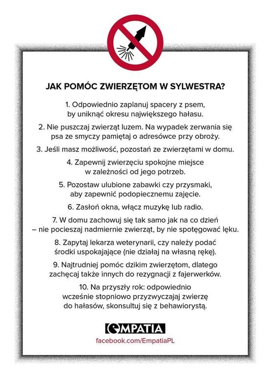 “Zamiast inwestować w hałas, huki i błyski, które krzywdzą naszych podopiecznych, otoczmy ich opieką. Jeśli nie mamy w domu zwierząt, pomyślmy o innych. Bawmy się dobrze i z empatią.” – apelują członkowie Stowarzyszenia Empatia na FB-kowym profilu. Zachęcają, aby dołączyć do FB-kowego wydarzenia: „Nie strzelam w Sylwestra 2015/2016”. Na profilu znajduje się poradnik do wydrukowania i wywieszenia na klatce schodowej. Można dowiedzieć się z niego, jak sprawić, by pies, królik czy fretka przeżyły w spokoju Sylwestra.