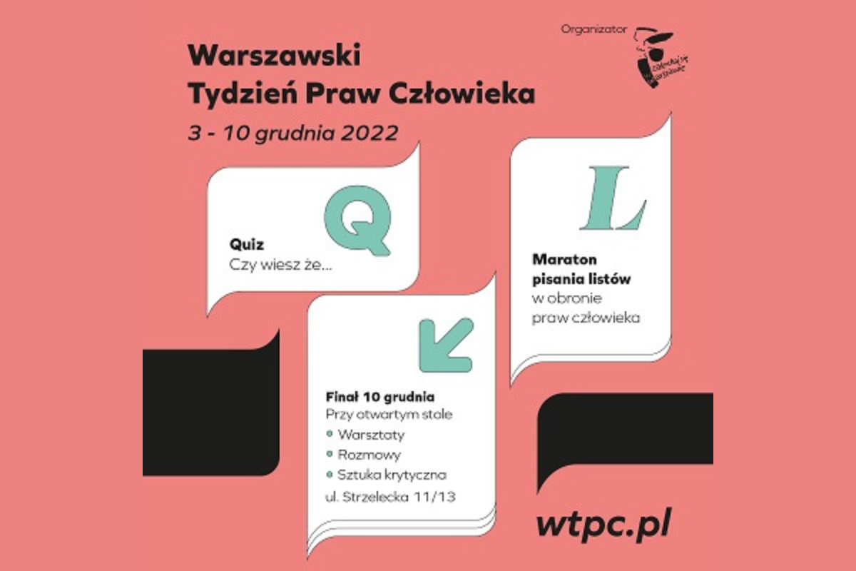 Jedną z aktywności Warszawskiego Tygodnia Praw Człowieka jest quiz edukacyjny „Czy wiesz, że…”. Można go rozwiązać na stronie wtpc.pl od 3 do 10 grudnia. Pytania dotyczą różnych obszarów praw człowieka, sytuacji kobiet, osób LGBT+, prawa pracy. Pytania przygotowały osoby eksperckie, przedstawiciele_ki instytucji oraz organizacji pozarządowych: Amnesty International, Grupy Granica, Stowarzyszenia Lambda Warszawa, Stowarzyszenia Tolerado, Fundacji Inicjatywa Dom Otwarty, Fundacji na rzecz Praw Ucznia, Polskiego Towarzystwa Prawa Antydyskryminacyjnego.