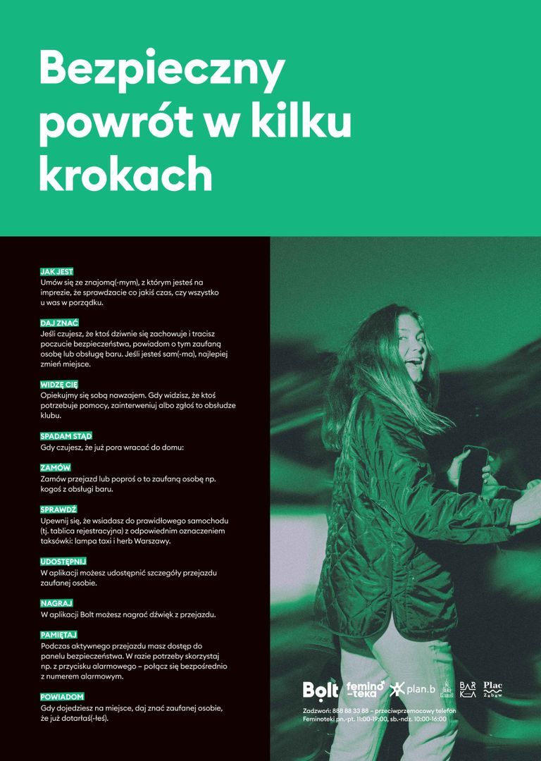Bolt, fundacja Feminoteka oraz warszawskie bary: Bar Studio, Plan B oraz Plac Zabaw połączyły siły i wspólnie rozpoczynają kampanię edukacyjną nt. bezpiecznych powrotów z imprez. Celem kampanii jest dotarcie do osób bawiących się w tych popularnych, stołecznych miejscach i wyposażenie ich w informacje na co zwracać uwagę podczas wychodzenia z imprezy i wracania do domu. To pierwsza taka współpraca Bolt w Polsce.