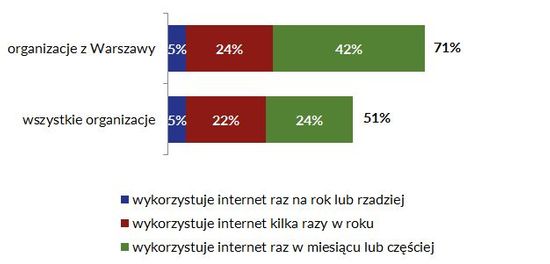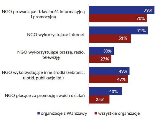 Warszawskie organizacje najczęściej promują swoje działania za pośrednictwem internetu – w tym celu z sieci korzysta 71% z nich (a więc niemal wszystkie, które w ogóle podejmują tego typu działania). Pod względem częstości zamieszczania w przestrzeni wirtualnej informacji na własny temat stołeczne organizacje wyróżniają się na tle całego sektora – 42% co najmniej raz na miesiąc publikuje w internecie jakieś informacje na temat swoich działań. Nie oznacza to jednak, że organizacje z Warszawy nie korzystają z innych kanałów upowszechniania materiałów informacyjnych i promocyjnych – 30% wykorzystuje prasę, radio lub telewizję, zaś 49% informuje o własnych działaniach na inne sposoby: na spotkaniach, zebraniach, przez ulotki, plakaty czy publikacje.