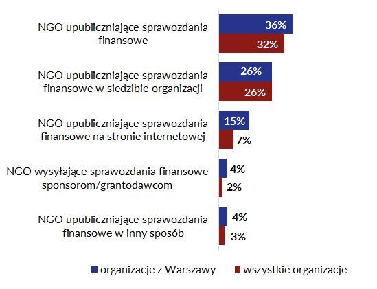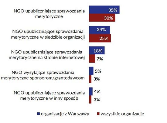 Jednak fakt przygotowywania przez organizacje sprawozdań dla większości z nich nie jest równoznaczny z ich upublicznieniem odbiorcom działań czy szerokiej opinii publicznej. Nieco ponad 1/3 warszawskich organizacji deklaruje, że upublicznia sprawozdania finansowe (36%) czy merytoryczne (35%). To nieco więcej niż w całym sektorze, gdzie robi to odpowiednio 32% i 30%, jednak ciągle zdecydowana większość organizacji – zarówno w Warszawie, jak i w całej Polsce – nie widzi potrzeby, aby przez udostępnienie sprawozdań zwiększać przejrzystość swoich działań.