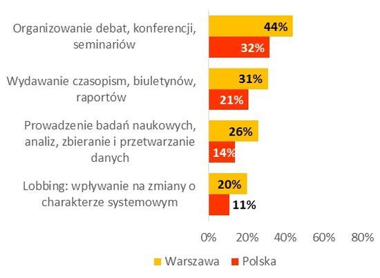 Podobne zależności dotyczą form działań podejmowanych przez warszawskie organizacje. Zdecydowanie częściej niż pozostałe stowarzyszenia i fundacje organizują one debaty, konferencje i seminaria, częściej prowadzą też badania naukowe i analizy, zbierają i przetwarzają dane. W Warszawie częściej zdarza się również, że organizacje zajmują się lobbingiem na rzecz zmian o charakterze systemowym, a także wydawaniem branżowych czasopism, biuletynów, raportów.