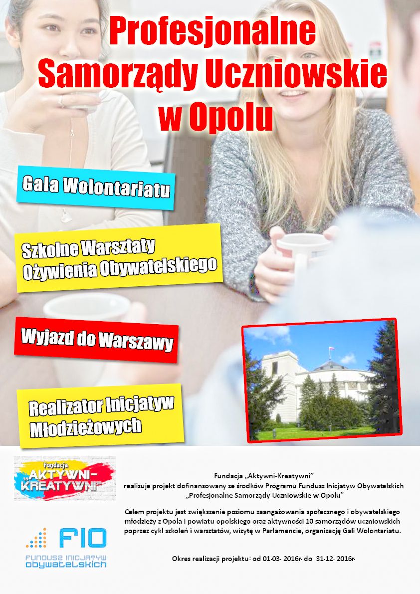 Fundacja "Aktywni-Kreatywni" zrealizowała szkolenia: Młodzieżowe Warsztaty Ożywienia Obywatelskiego w ramach projektu "Profesjonalne Samorządy Uczniowskie w Opolu", sfinansowanego ze środków Programu Fundusz Inicjatyw Obywatelskich.