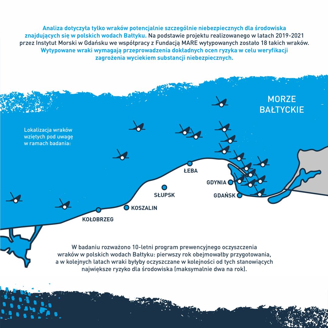 W badaniu przeprowadzono analizę kosztów i korzyści (z punktu widzenia społeczeństwa Polski) programu prewencyjnego oczyszczenia wraków zatopionych w polskiej strefie Bałtyku z paliw i innych substancji niebezpiecznych. Taka analiza pozwala ocenić, czy z ekonomicznego punktu widzenia taki program opłaca się wprowadzać – to znaczy, czy program przyniesie więcej korzyści niż kosztów. W ramach badania rozważono 10-letni program - pierwszy rok obejmowałby przygotowania i dokonanie ocen ryzyka stwarzanego przez wraki, a w kolejnych latach wraki zakwalifikowane jako niebezpieczne byłyby oczyszczane w kolejności od tych stanowiących największe ryzyko dla środowiska. Analiza dotyczyła tylko wraków potencjalnie niebezpiecznych dla środowiska znajdujących się w polskich wodach Bałtyku. Na podstawie projektu zrealizowanego w latach 2019-2021 przez Instytut Morski w Gdańsku we współpracy z Fundacją MARE wytypowanych zostało 18 takich wraków. Wytypowane wraki wymagają przeprowadzenia dokładnych ocen ryzyka w celu weryfikacji istniejącego zagrożenia dla środowiska.