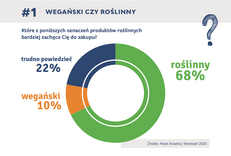 Poproszeni o wybór pomiędzy produktem „100% wegańskim”, a „100% roślinnym”, 68% respondentów wskazało produkt „100% roślinny” jako oznaczenie, które bardziej skłoni ich do jego zakupu. Jedynie 10% uważa oznaczenie „100% wegański” jako bardziej zachęcające, natomiast 22% nie miało na ten temat zdania.
