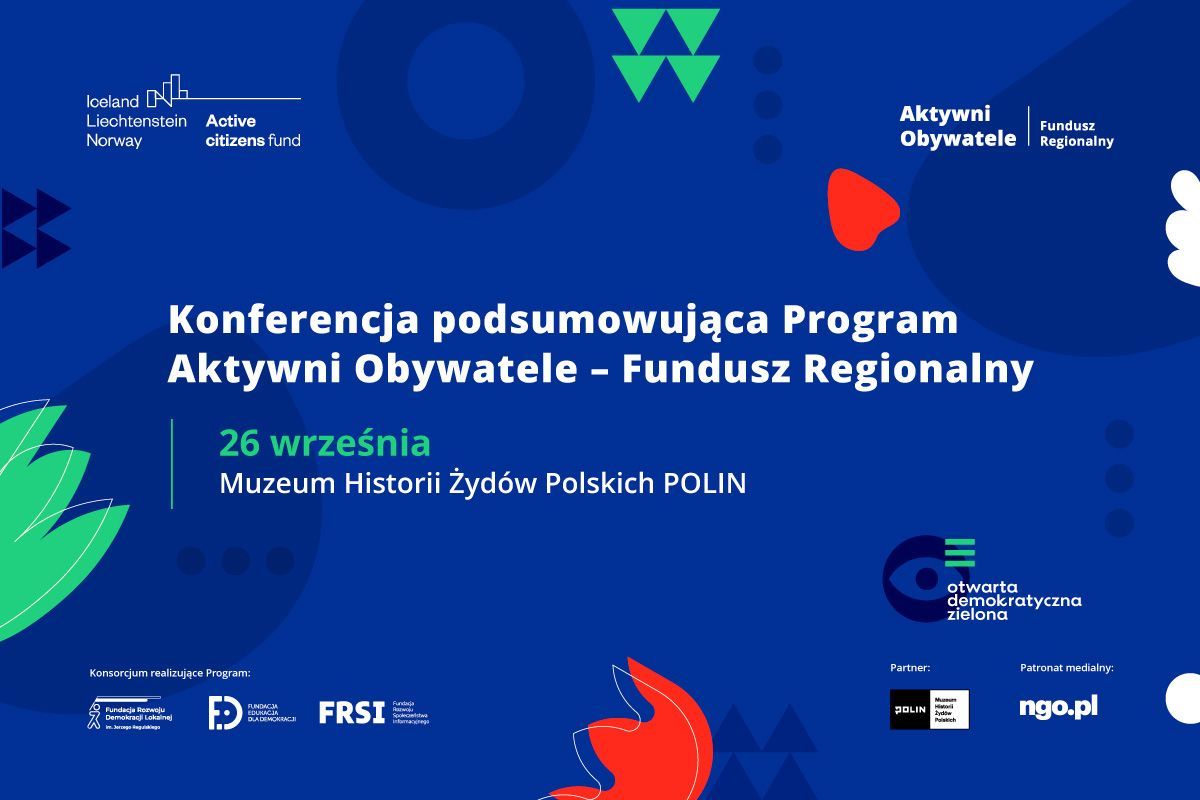 Zapraszamy do udziału w konferencji podsumowującej Program Aktywni Obywatele – Fundusz Regionalny, która odbędzie się 26 września 2024 r. w godz. 10.00–16.15 w Muzeum Historii Żydów Polskich POLIN w Warszawie. Konferencja realizowana jest pod hasłem „Otwarta, demokratyczna, zielona”, nawiązując do hasła Funduszy Norweskich i EOG, które przyczyniają się do współtworzenia bardziej włączającej, demokratycznej i zielonej Europy.