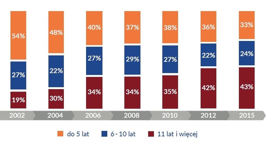 Już od kilku edycji badań Klon/Jawor obserwujemy wzrost odsetka najstarszych organizacji – obecnie stowarzyszenia i fundacje istniejące 11 lub więcej lat stanowią już 43% sektora. Jednocześnie systematycznie zmniejsza się grupa organizacji „najmłodszych”, działających nie więcej niż 5 lat. Przesunięcia w poszczególnych kategoriach wiekowych są niewielkie, jednak ich kierunek wyraźnie wskazuje na proces „krzepnięcia” polskiego sektora pozarządowe.