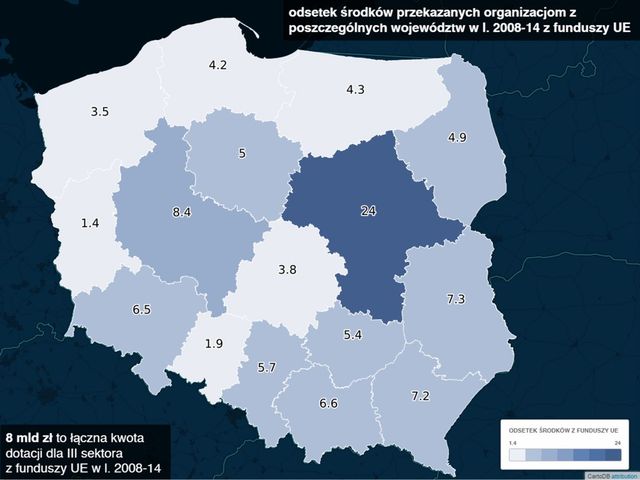 Fundacje i stowarzyszenia z pozostałych województw musiały się zadowolić znacznie mniejszymi kwotami dotacji. Organizacje z województwa opolskiego otrzymały niecałe 2 proc. wszystkich funduszy europejskich przekazanych III sektorowi w latach 2008-2014, a organizacje z województwa lubuskiego – tylko 1,4 proc. całej kwoty.