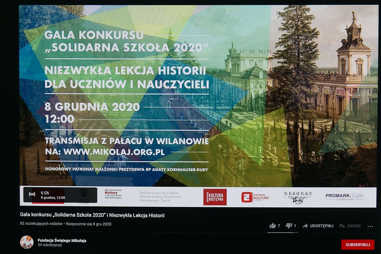 8 grudnia z Pałacu w Wilanowie odbyła się transmisja Gali konkursu „Solidarna Szkoła 2020” i Niezwykła Lekcja Historii. Gala konkursu „Solidarna Szkoła” to coroczne święto organizowane przez Fundację Świętego Mikołaja, aby uhonorować te polskie szkoły, które w ostatnim roku wykazały się wyjątkową solidarnością i największym zaangażowaniem w pomoc swoim zdolnym uczniom z niezamożnych rodzin.