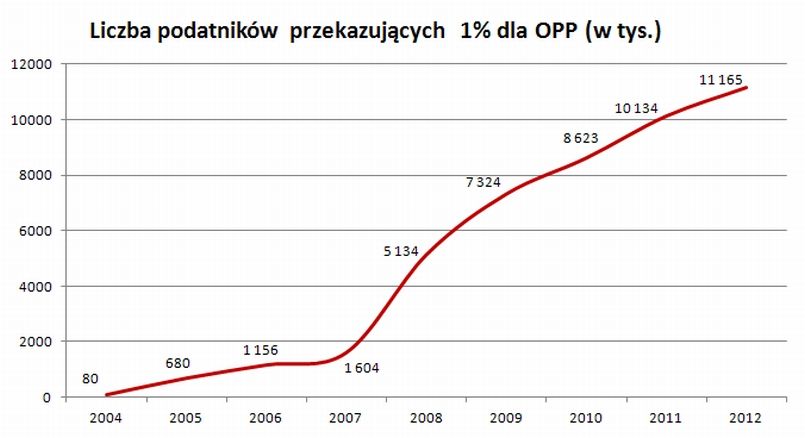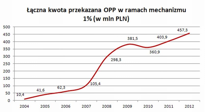 W pierwszym roku obowiązywania ustawy do organizacji trafiło 10 mln zł, ale już cztery lata później kwota była dziesięciokrotnie wyższa – przekroczyła 100 mln zł. Potem nastąpił szybki wzrost wynikający głównie z opisanego wyżej uproszczenia przepisów: w 2008 roku organizacje pozyskały już blisko 300 mln, a w 2009 – prawie 400 mln zł. Kolejny rok był nieco gorszy, bo choć wzrosła liczba osób przekazujących 1%, to jednak łączna kwota przekazana organizacjom spadła, co wynikało m.in. z obniżenia stawek podatkowych (trzy progi 19%, 30% i 40% zastąpiono dwoma: 18% i 32%) i zmniejszenia w efekcie łącznej kwoty odprowadzonego przez Polaków podatku. Kolejne dwa lata przyniosły już jednak tylko wzrost i, jak wynika z podsumowania Ministerstwa Finansów, w 2012 roku do organizacji pożytku publicznego trafiło 457 mln zł pochodzących z przekazów 1% podatku należnego za rok 2011.