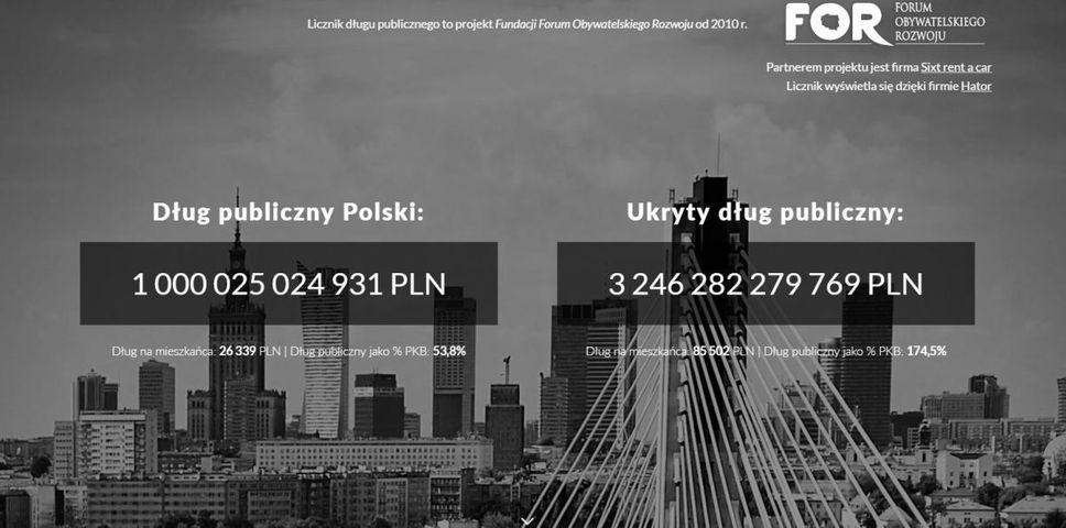 10 stycznia 2017 r. wielkość jawnego długu publicznego pokazywana na liczniku FOR w centrum Warszawy przekroczyła bilion złotych. Ten bilion złotych to długi, które w imieniu nas, mieszkańców Polski, zaciągnął rząd i władze samorządowe. W przeliczeniu na jednego mieszkańca, oznacza to, że każdy z nas został zadłużony na ponad 26 tys. zł. To z naszych podatków rząd będzie spłacał odsetki od tego długu.