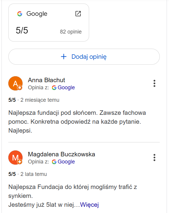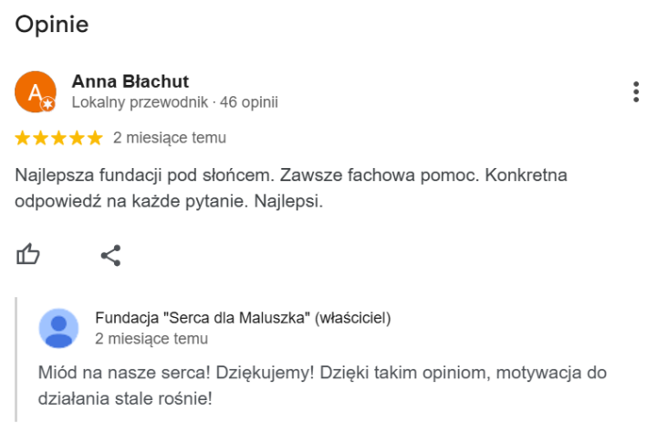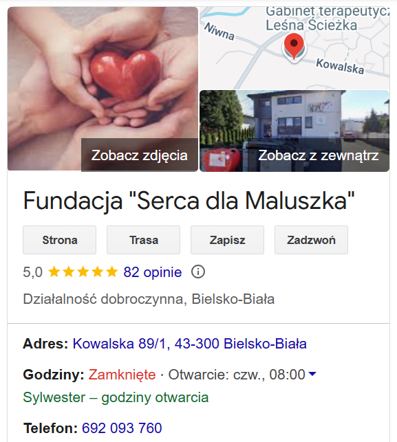 Oto przykład poprawnie uzupełnionej wizytówki Google Fundacji „Serca dla Maluszka”, która po wpisaniu w wyszukiwarkę nazwy tej fundacji pojawia się na ekranie po prawej stronie. Potencjalny darczyńca czy wolontariusz od razu może przekonać się, że organizacja jest widoczna w Internecie. Zwiększa to zaufanie do organizacji.