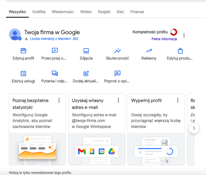 Warto zadbać o dobrą jakość i odpowiednią liczbę zdjęć. Istotne jest też, aby adres Waszej siedziby był poprawnie wprowadzony w Mapach Google. Często, gdy ktoś po raz pierwszy chce dotrzeć autem czy komunikacją miejską do siedziby organizacji, posługuje się wyszukiwarką Google oraz Mapami Google.