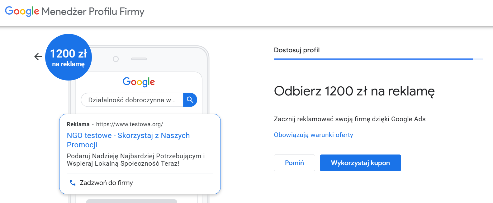 Bonusem od firmy Google gdy zakładasz wizytówkę po raz pierwszy, jest budżet na reklamę w Google Ads na kwotę 1200 zł. Sprawdź, jak wydać dodatkowe środki na reklamę: https://www.google.com/business/