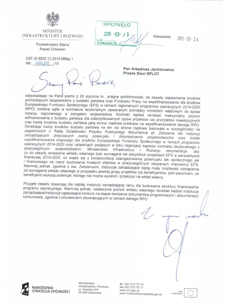 Sieć SPLOT otrzymała odpowiedź z Ministerstwa Infrastruktury i Rozwoju na pismo w sprawie wkładów własnych EFS 2014-2020.