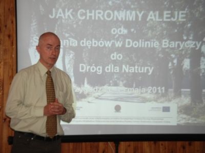 Piotr Tyszko-Chmielowiec przedstawił zebranym genezę pomysłu oraz główne działania realizowane w różnych regionach Polski w ramach programu "Drogi dla Natury", w tym w szczególności w ramach projektu "Drogi dla Natury - aleje przydrożne jako korytarze ekologiczne dla pachnicy dębowej". Wspomniał o akcji społecznej "Sadzimy dęby w Dolinie Baryczy", z której wyrósł program Drogi dla Natury", a w której mieszkańcy gminy Przygodzice aktywnie uczestniczą. Opowiedział także o nasadzeniach przeprowadzanych na terenie Doliny Baryczy, pokazując mapę ilustrującą miejsca, gdzie rosną młode drzewa. Okazuje się, że w Dolinie Baryczy miejsc tych jest juz bardzo dużo i coraz trudniej znaleźć kolejne, spełniające odpowiednie warunki do nasadzeń.