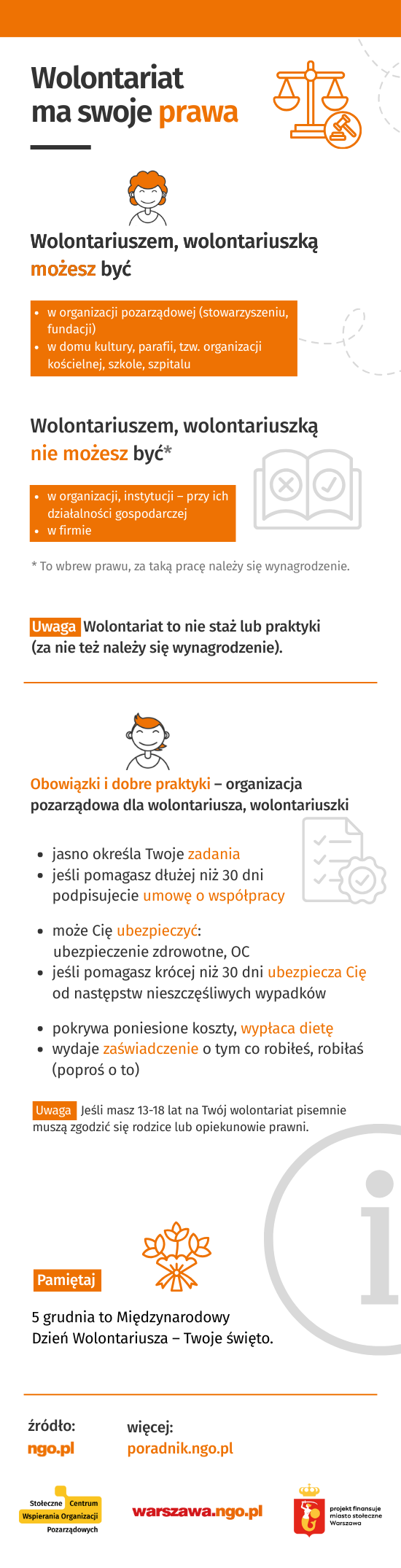 Działasz czy korzystasz? Sprawdź na infografice, jakie prawa ma wolontariusz. Przypominamy organizacjom pozarządowym i działającym w NGO-sach wolontariuszom i wolontariuszkom, jakie relacje ich łączą.