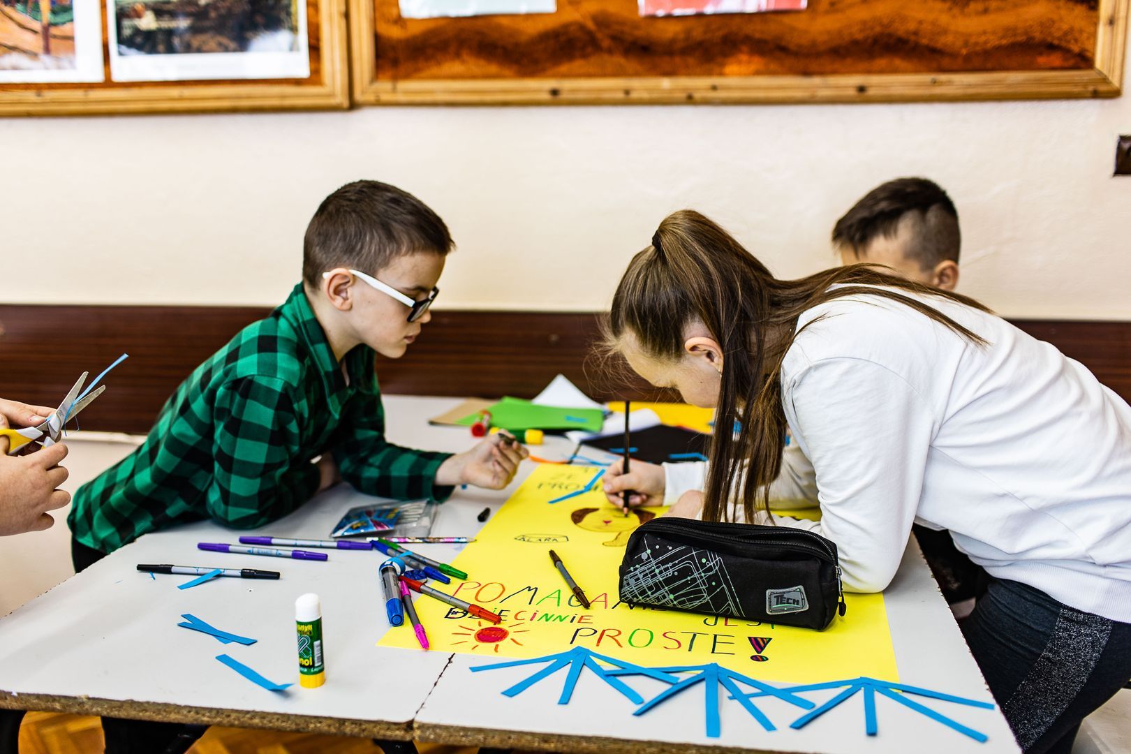 Uczniowie w dalszej części zajęć samodzielnie przygotowywali materiały do zbiórki charytatywnej, którą przeprowadzają na terenie szkoły – na rzecz wybranej placówki. Projektowali plakaty i ozdabiali pudełko, do którego zbierają potrzebne rzeczy. Dzieci pracując nad projektami, doskonaliły umiejętność współpracy w grupie, z szacunkiem słuchały siebie i pracowały razem nad osiągnięciem, jak najlepszego efektu – co dawało im dużo radości, a zakończone prace ogromną satysfakcję.