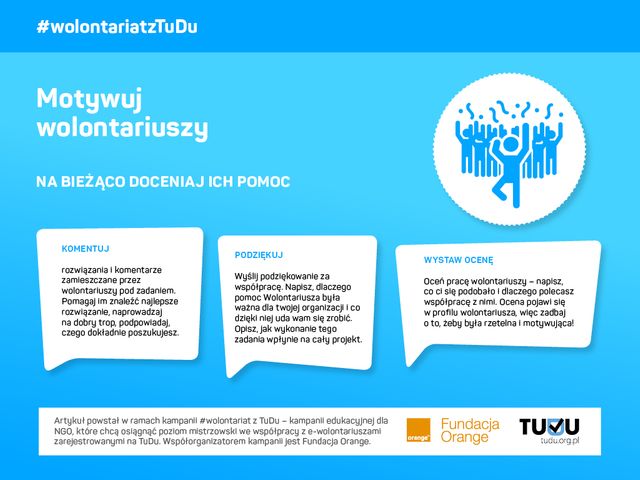 Artykuł powstał w ramach kampanii #wolontariat z TuDu – kampanii edukacyjnej dla NGO, które chcą osiągnąć poziom mistrzowski we współpracy z e-wolontariuszami zarejestrowanymi na TuDu. Współorganizatorem kampanii jest Fundacja Orange.