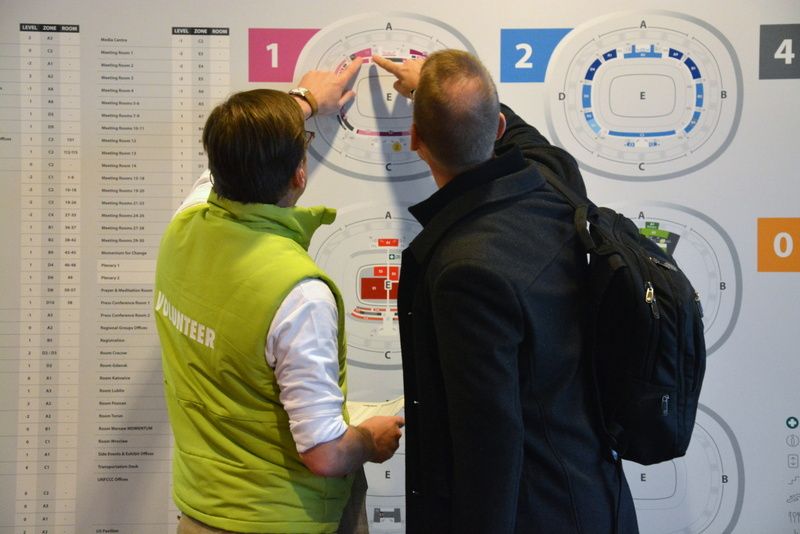 Wolontariusze pomagali odnaleźć się delegatom w przestrzeniach stadionu, wspierali osoby niepełnosprawne, informowali o sposobach powrotu do hoteli, o warszawskich atrakcjach turystycznych, czy miejscach z tradycyjną, polską kuchnią. Pojawiały się także mniej oczywiste pytania, np. o to, kiedy spadnie śnieg (marzenie jednego z delegatów) oraz gdzie znajduje się morze, skoro Stadion Narodowy leży przy wybrzeżu (obiekt jest zlokalizowany przy ul. Wybrzeże Szczecińskie).