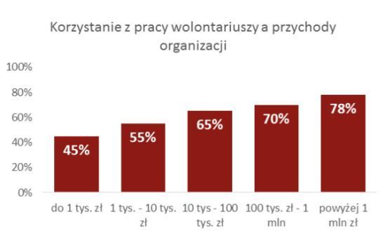 Współpraca z wolontariuszami jest też najbardziej typowa dla fundacji i stowarzyszeń o największych budżetach. Wśród najmniej zasobnych organizacji wystarczającym wkładem pracy jest zazwyczaj aktywność członków, czyli tak zwany wolontariat wewnętrzny. Fundacje i stowarzyszenia o największych budżetach działają na ogół na większą skalę, a zapotrzebowanie na pracę wolontariuszy jest tym samym wśród nich większe. Nie oznacza to jednak, że działają „bardziej społecznie”, niż biedniejsze organizacje. Im większy budżet, tym więcej nie tylko wolontariuszy, ale także płatnych pracowników.
