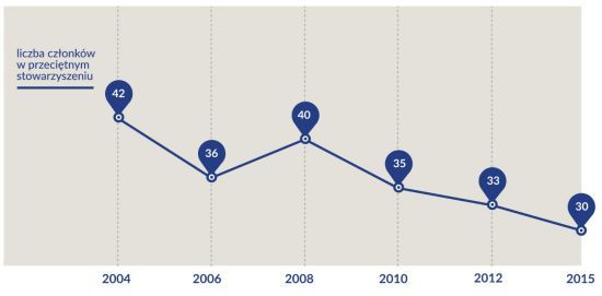 Skąd bierze się coraz większe zapotrzebowanie organizacji na pracę wolontariuszy? Jednym z powodów może być poziom zaangażowania członków stowarzyszeń w życie swoich organizacji. Mówimy tutaj oczywiście tylko i wyłącznie o stowarzyszeniach, gdyż fundacje, stanowiące 17% sektora pozarządowego, w świetle prawa członków nie mają. Od 2008 roku obserwujemy systematyczny spadek liczebności członków stowarzyszeń. W 2015 roku przeciętne stowarzyszenie liczy trzydzieści osób, podczas gdy jeszcze siedem lat temu było ich czterdzieści.