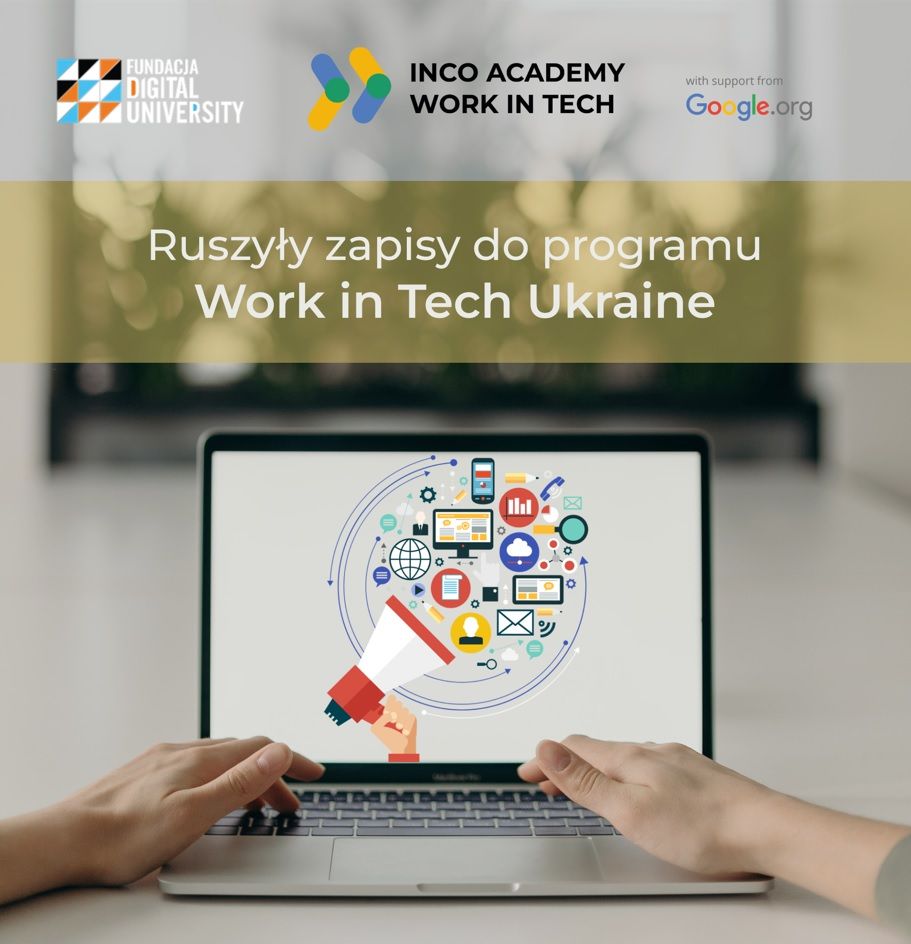 Fundacja Digital University rozpoczęła rekrutację do programu Work in Tech Ukraine, którego celem jest wyposażenie uchodźców z Ukrainy w kluczowe umiejętności i wiedzę z zakresu IT. Uczestniczy otrzymają dostęp do kursów oferowanych przez Google.org: IT Support i Digital Marketing & E-Commerce oraz warsztaty społeczno-psychologiczne i szkolenia podnoszące mobilność zawodową. Fundacja rekrutuje 350 osób, a w całym programie przygotowanym przez INCO weźmie udział 1500 Ukraińców przybywających w Polsce.
