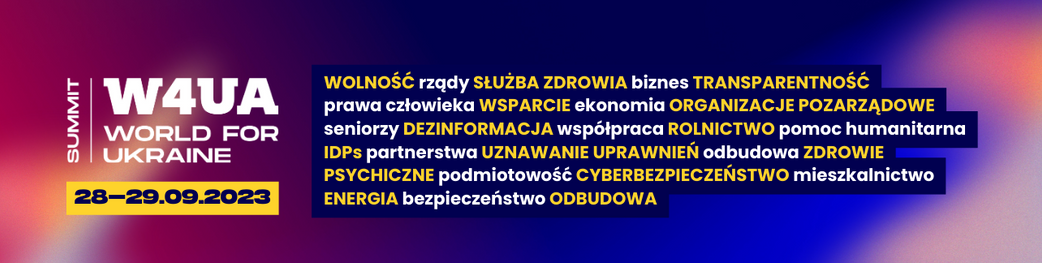 Szczyt „World For Ukraine” (W4UA) to ważne międzynarodowe wydarzenie humanitarne, które gromadzi co roku organizacje, instytucje i osoby z całego świata, chcące wspólnie stawić czoła wyzwaniom stojącym przed Ukrainą. Koncentrując się na wspólnych rozwiązaniach i działaniach, W4UA ma na celu wspieranie Ukrainy w dążeniu do wolności, odbudowy i zrównoważonego rozwoju. Pierwsza edycja szczytu odbyła się w dniach 7-9 grudnia 2022 r., a 19 kwietnia 2023 r. opublikowany został „Raport W4UA 2022” podsumowujący całe wydarzenie.