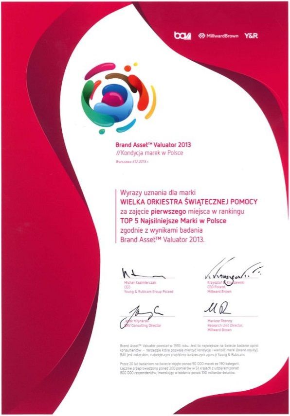 WOŚP zajęło pierwsze miejsce wśród marek najbardziej rozpoznawalnych w naszym kraju. Na podium znalazły się także Rafaello i Ptasie Mleczko. Wśród 50 najbardziej rozpoznawalnych marek znalazły się także TVN (8. pozycja), Coca-Cola (13. pozycja), Google (20. pozycja) czy Justyna Kowalczyk, która znalazła się na 30. miejscu. Marka WOŚP osiągnęła bardzo wysokie rezultaty we wszystkich badanych kategoriach – zarówno pod względem wyróżnialności, adekwatności, szacunku jak i wiedzy. Dzięki powyższym fundacji został przyznany archetyp wojownika, co sprowadza się do tego, że jej najsilniejsze cechy to m.in. marka zdrowa, wyjątkowa, z osiągnięciami, odpowiedzialna społecznie, najlepsza czy przyjazna.