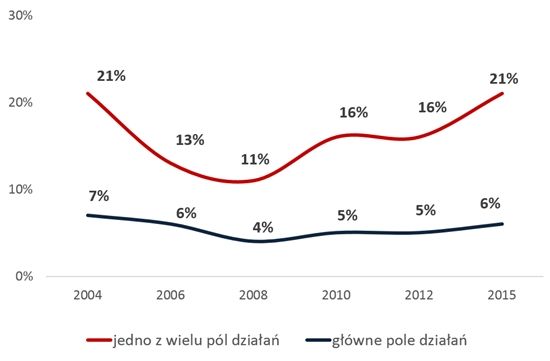 Między rokiem 2004 a 2008 obserwowaliśmy w sektorze spadek udziału organizacji działających na rzecz rozwoju lokalnego, a następnie – od 2010 do 2015 – powrót do poziomu sprzed 11 lat. Warto przyjrzeć się przyczynom tych procesów.