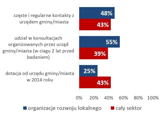 Częściej niż przedstawiciele innych branż sektora organizacje działające na rzecz rozwoju lokalnego angażują się w konsultacje organizowane przez lokalny samorząd – brała w nich udział ponad połowa organizacji rozwoju lokalnego (55%), podczas gdy w całym sektorze zaangażowane w konsultacje lokalne było 39% stowarzyszeń i fundacji. Z drugiej strony, organizacje rozwoju lokalnego rzadziej niż inne organizacje otrzymują dotacje z samorządu lokalnego. W całym sektorze 43% organizacji realizowało w 2014 roku zadania publiczne finansowane ze środków urzędu gminy lub miasta, zaś wśród organizacji rozwoju lokalnego było ich 25%.